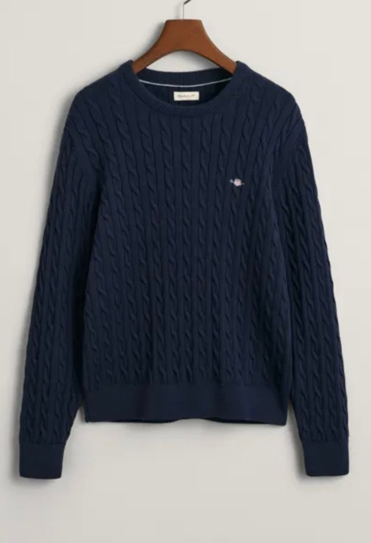 Flettet genser fra Gant i mørkeblå, med liten logo på venstre bryst. Laget av 100% bomull.