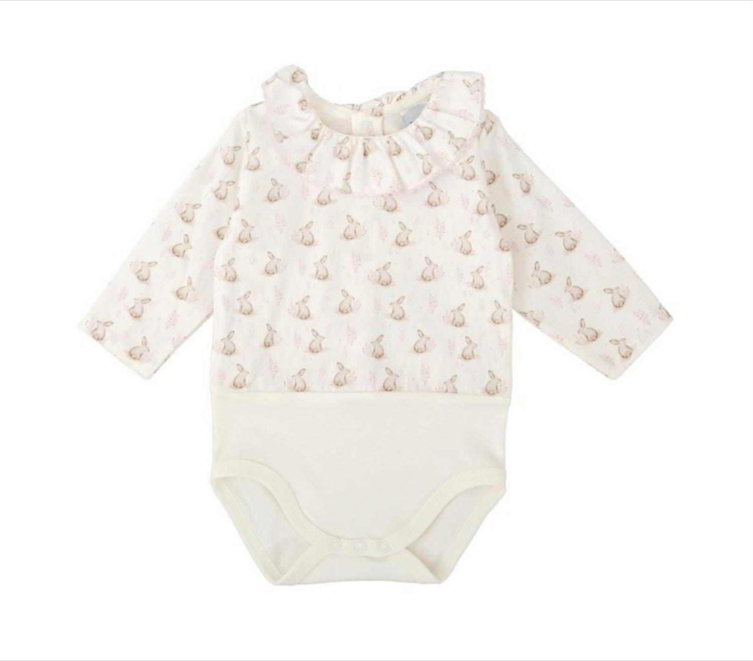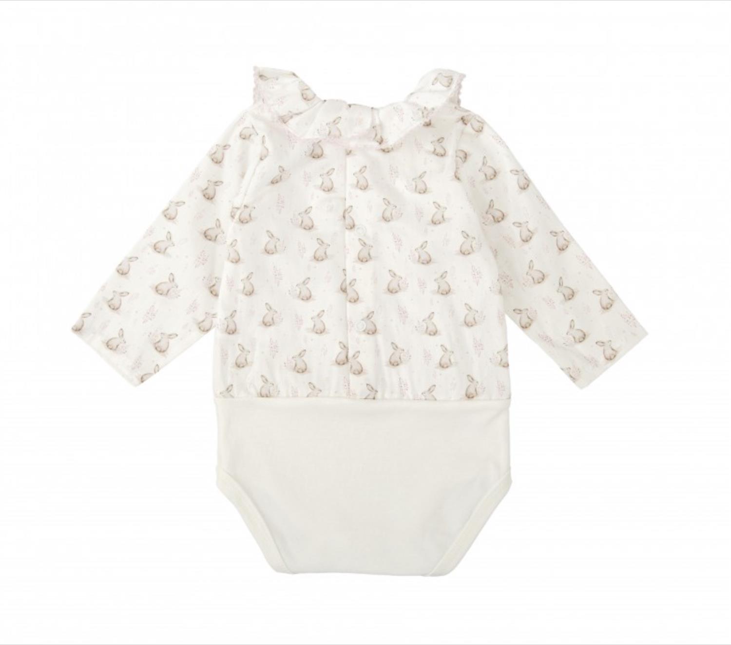 Nydelig, hvit body med rund krage fra Babidu i 100% bomull. Bodyen har kanin print.