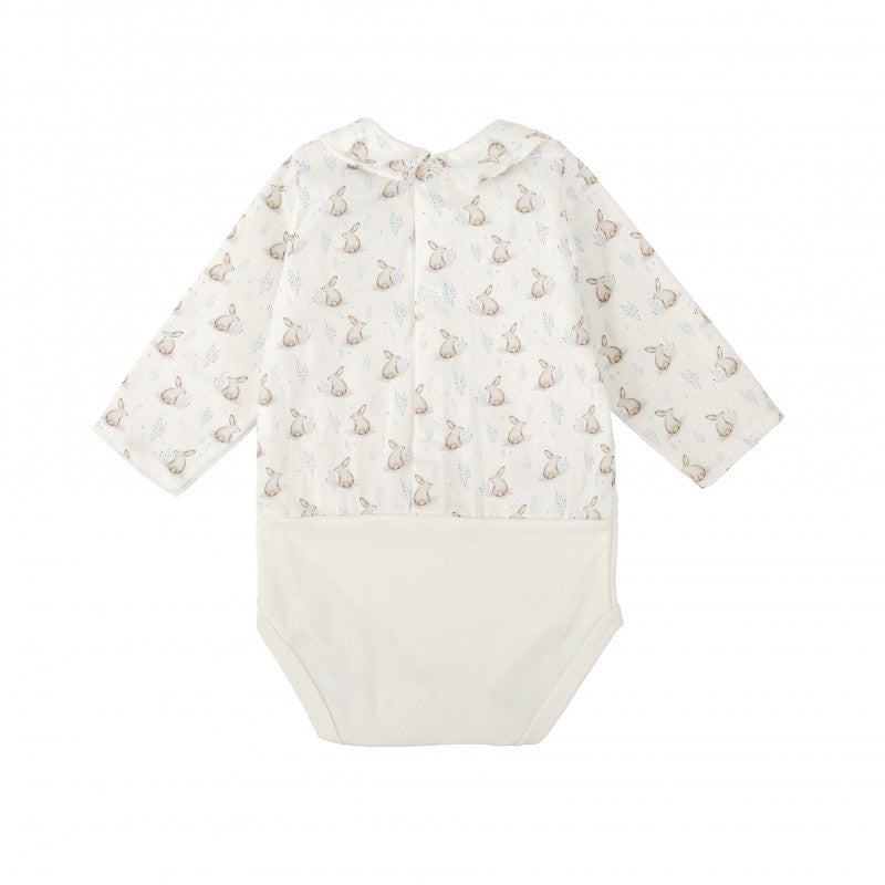 Nydelig, hvit body med skjorte- krage fra Babidu i 100% bomull. Bodyen har kanin print.