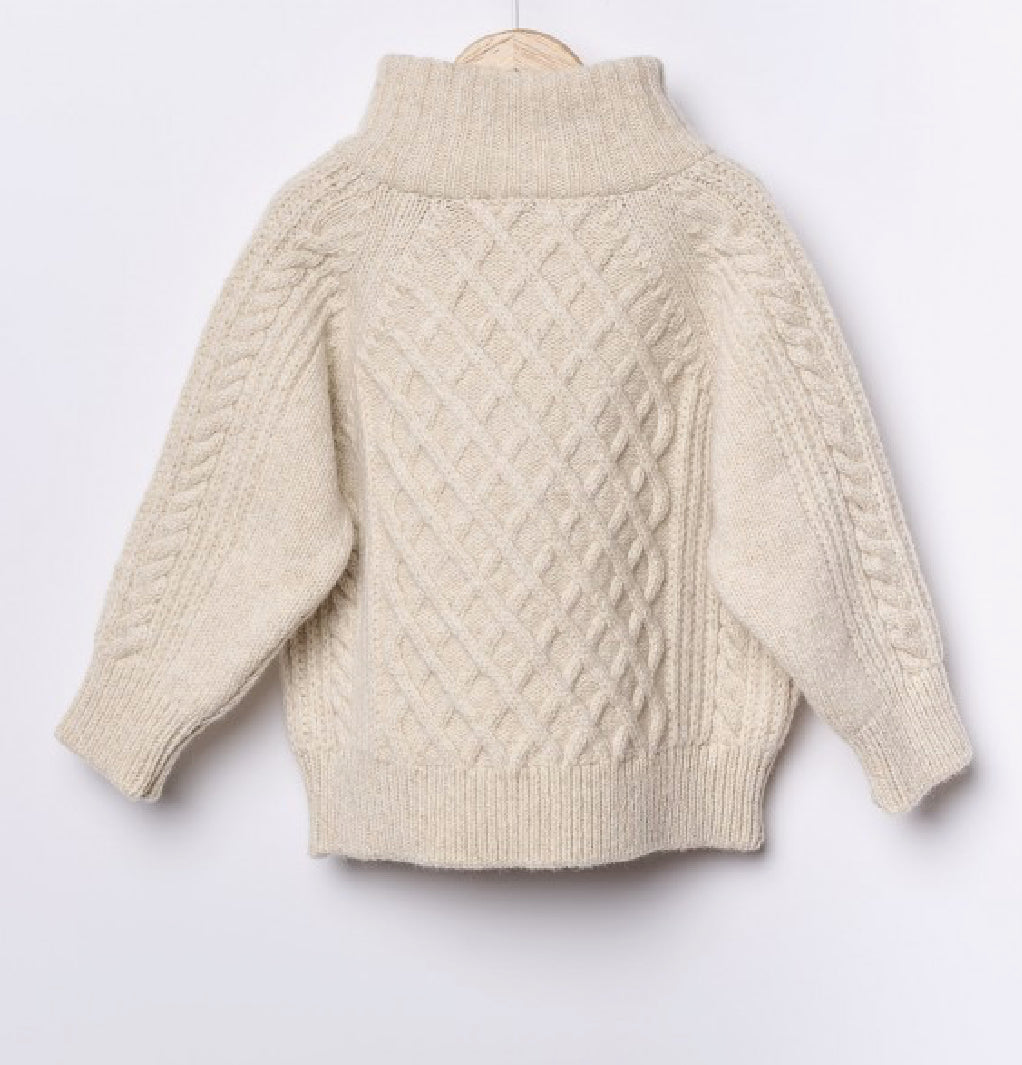 Nydelig, beige ullgenser med flettemønster og glidelås i hals. Genseren er i 100% extrafine merinoull.