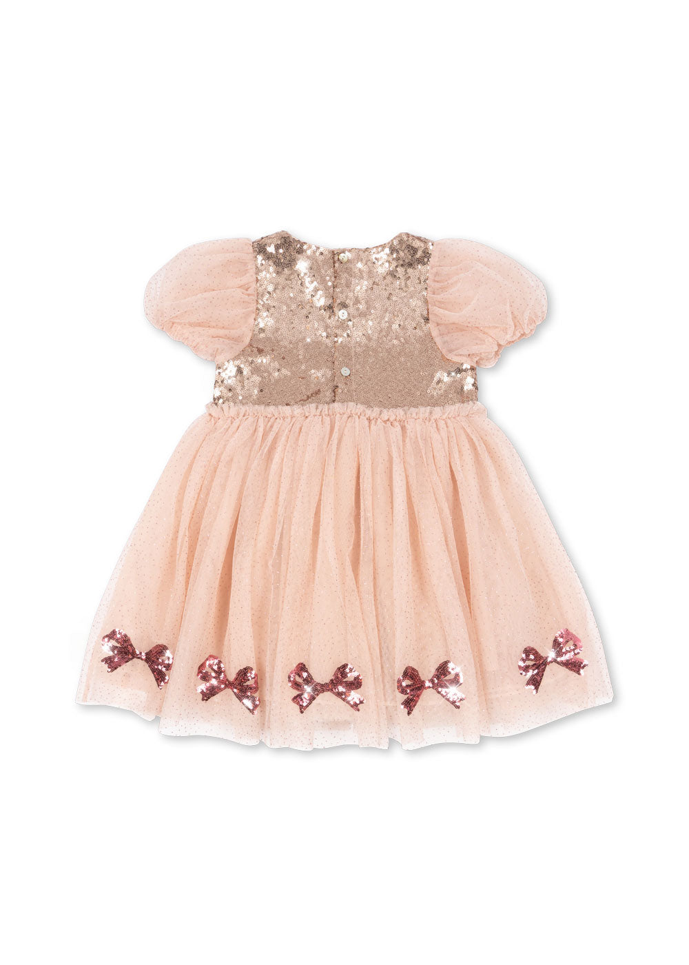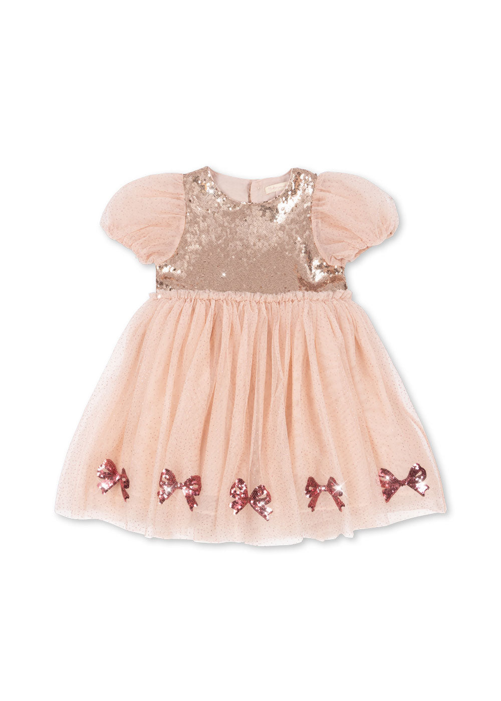 Nydelig, rosa tyllkjole fra Konges Sløjd. Broderte sløyfer og gull prikker i tyllen og paljetter på livstykket. Kjolen har puffermer.