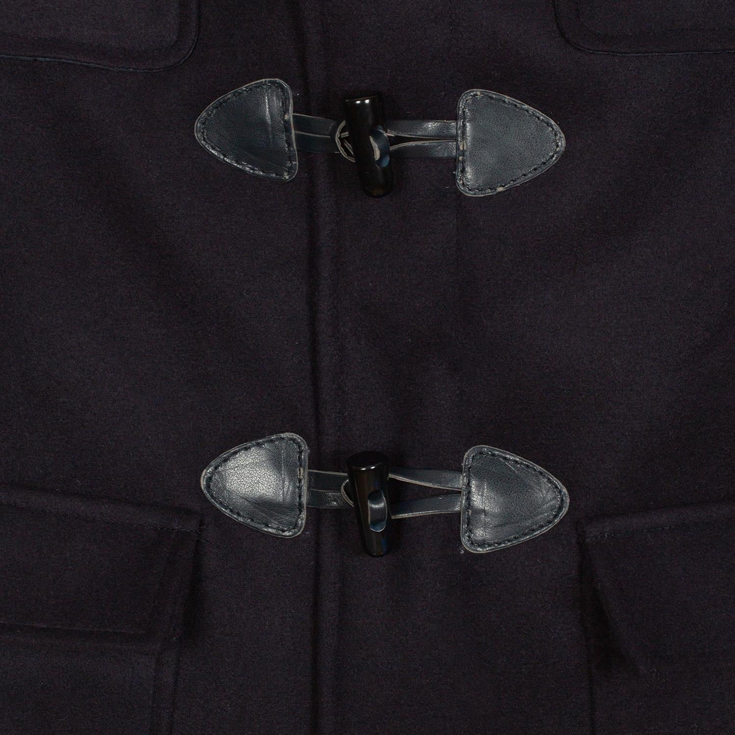 Nydelig, mørkblå duffelcoat med skinndetaljer fra Patachou i 93% polyester, 5% viscose og 2% elastin. Foret er in100% bomull.