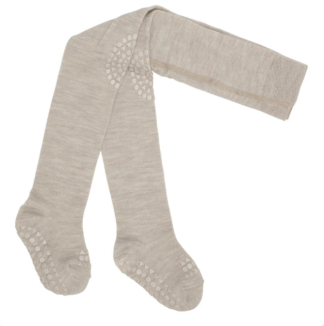 Beige merinoull strømpebukse fra GOBABYGO med antiskli over tær, under fot og på knær.