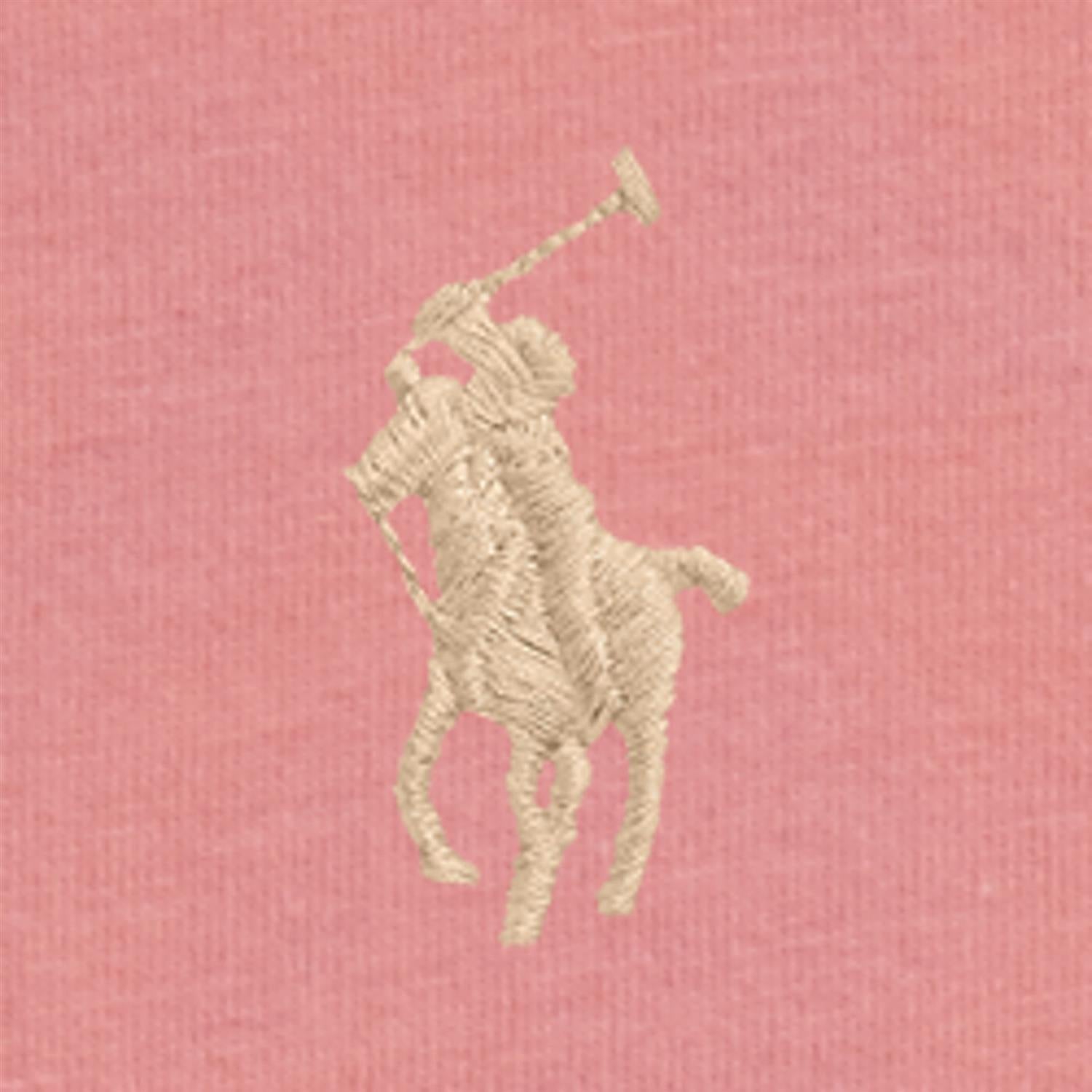 Rosa T-skjorte fra Ralph Lauren. Gul brodert hest på venstre bryst.
