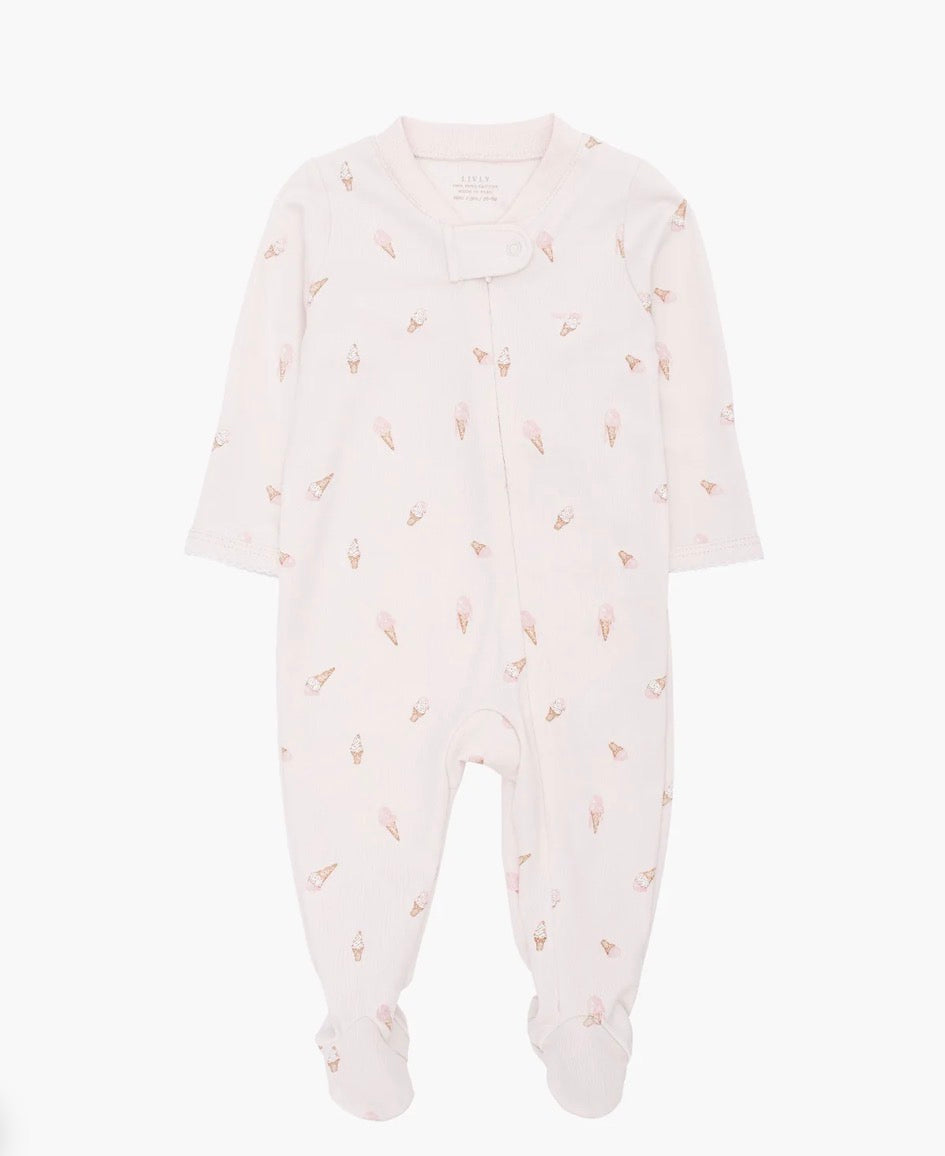Nydelig pyjamas med føtter fra Livly i lysrosa i Ice cream printet.