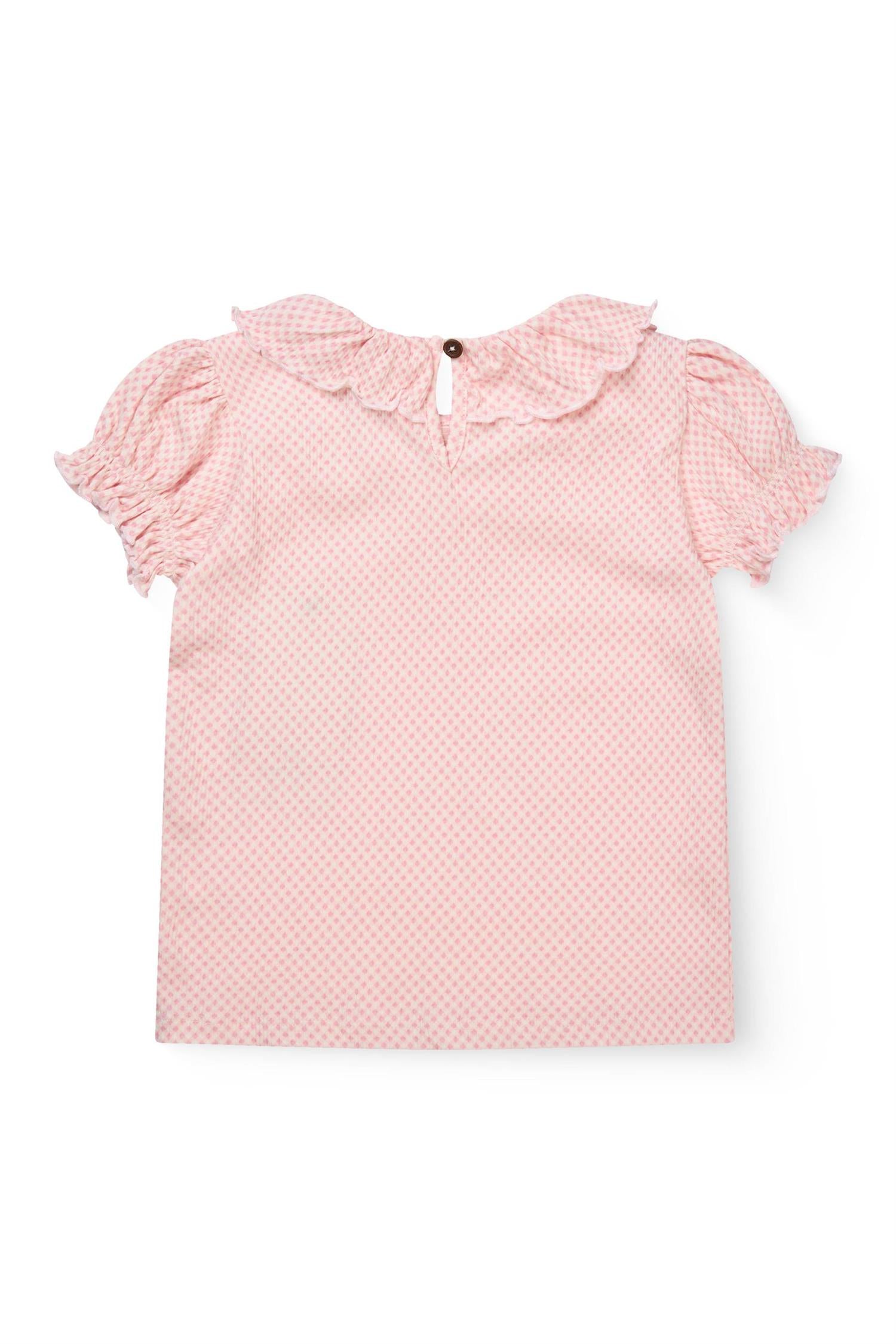 Rosa og hvitrutet bluse med myk stretchkvalitet i 98% bomull og 2% elastan. Nydelig blondekrage og puffermer gjør denne blusen fin til jenter 2-8 år.