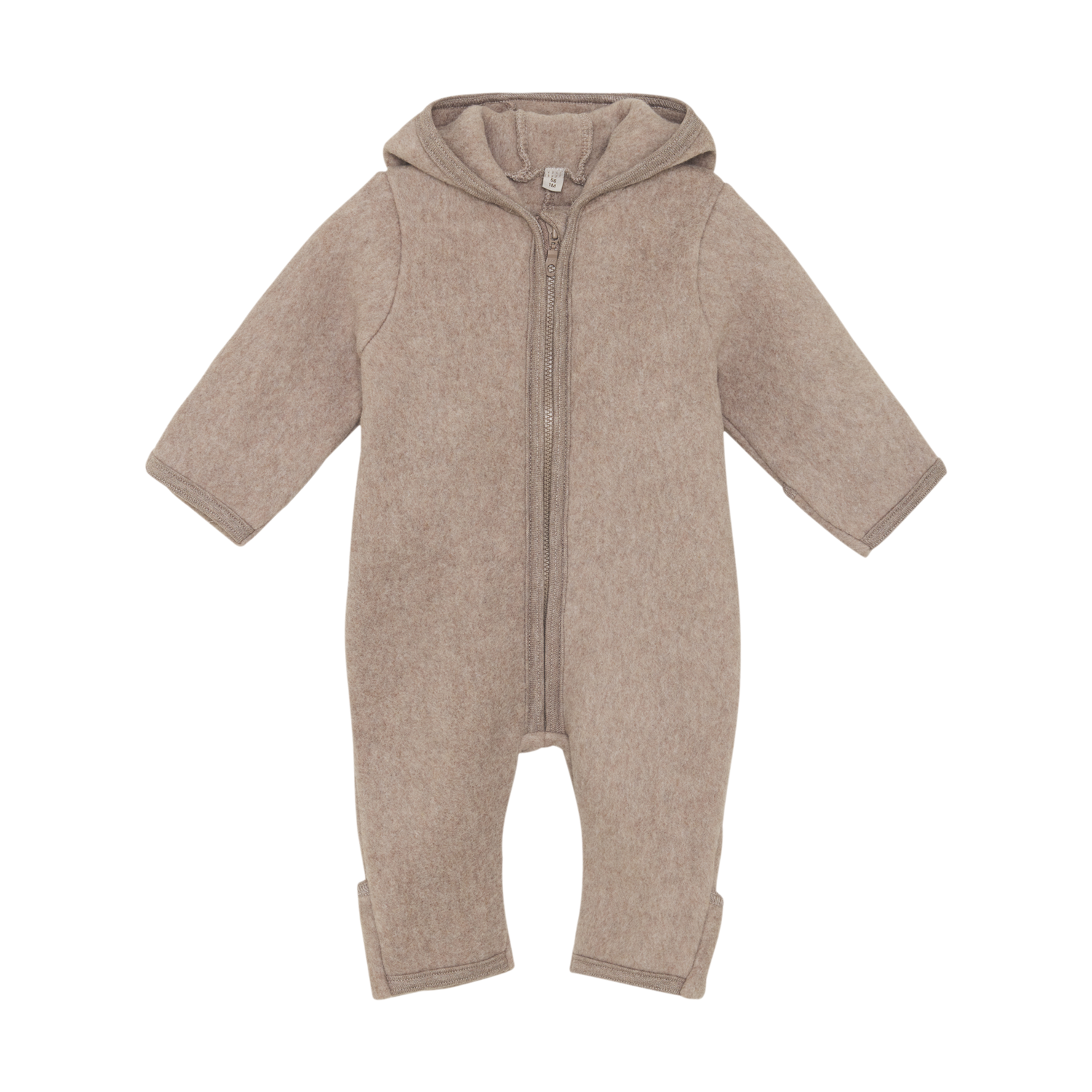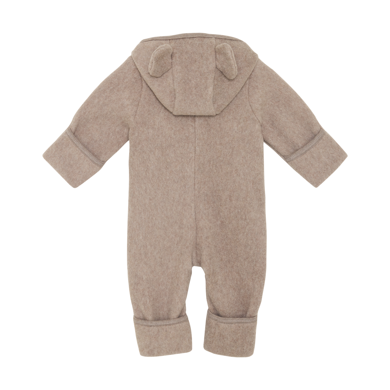 Myk bomullsfleecedress fra Huttelihut med søte ører på hetten. 100% bomull, glidelås og mulighet for å brette over votter og sokker. Passer babyer 0-1 år.