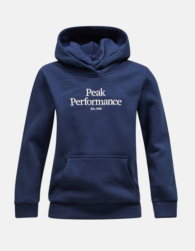 Blå hettegenser fra Peak Performance i 80% bomull og 20% polyester.