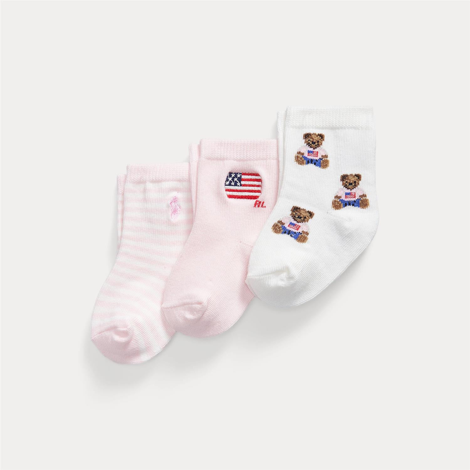 3-pakning Polo Ralph Lauren sokker til jente i 0-2 år. Inneholder hvite, rosa og stripete sokker med bamse- og flaggmotiv. Materiale: 64% bomull, 31% polyester, 3% elastin, 2% andre fibre.