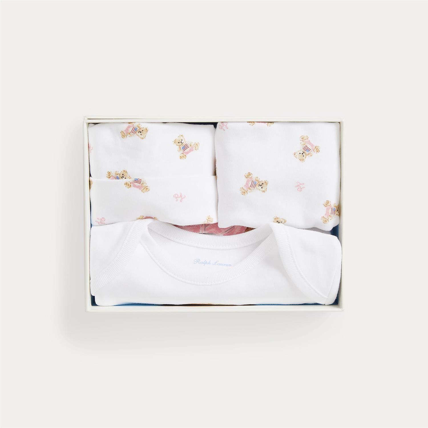 Gaveeske fra Polo Ralph Lauren med body, smekke og lue i 100% bomull. Passer babyjenter 0-1 år.